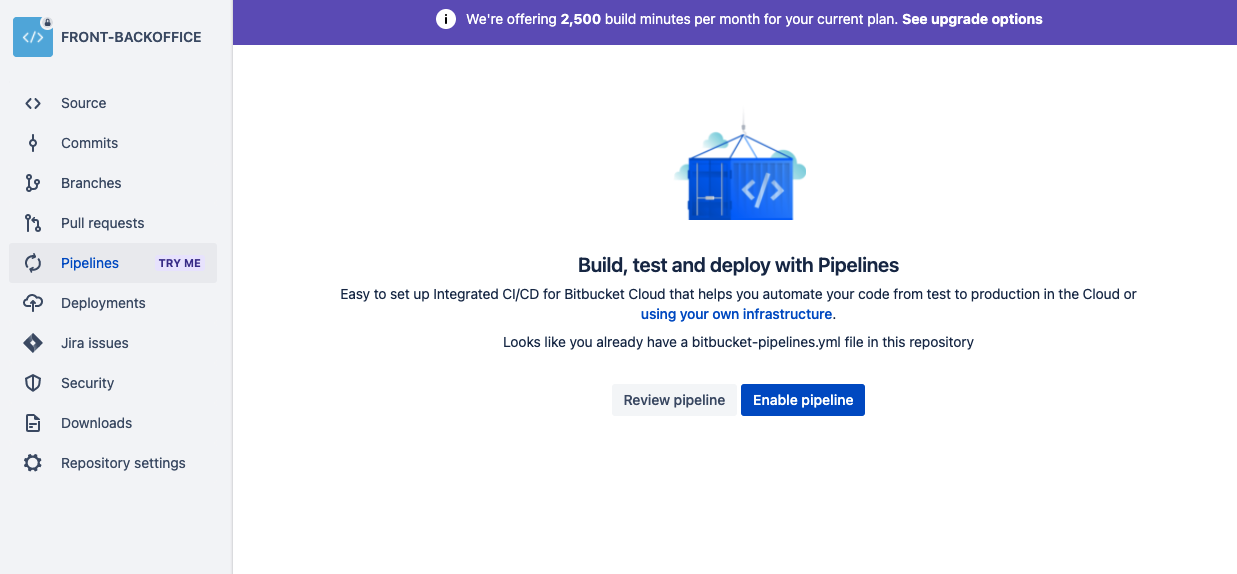 일단 Bitbucket에서 pipeline을 사용하겠다고 설정을 해줘야합니다.