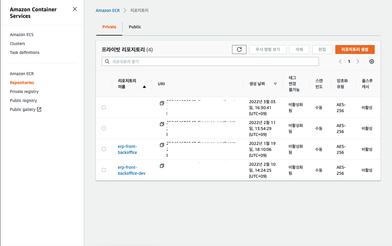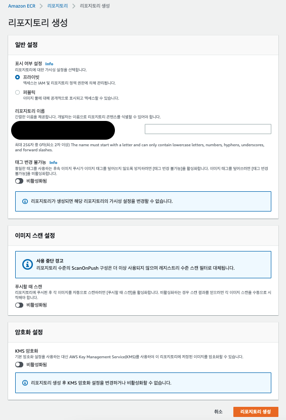 리포지토리 이름은 저의 경우는 생성할 이미지 명과 동일하게 만들었습니다.